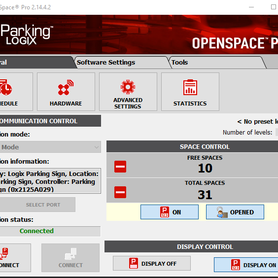 The OpenSpace parking solution also includes the OpenSpace Pro software package. Set times of sign operation, reset or adjust the counter, and get statistics related to garage occupancy. OpenSpace Pro comes pre-loaded on a Windows tablet or laptop that connects directly to the OpenSpace VMS via Bluetooth.